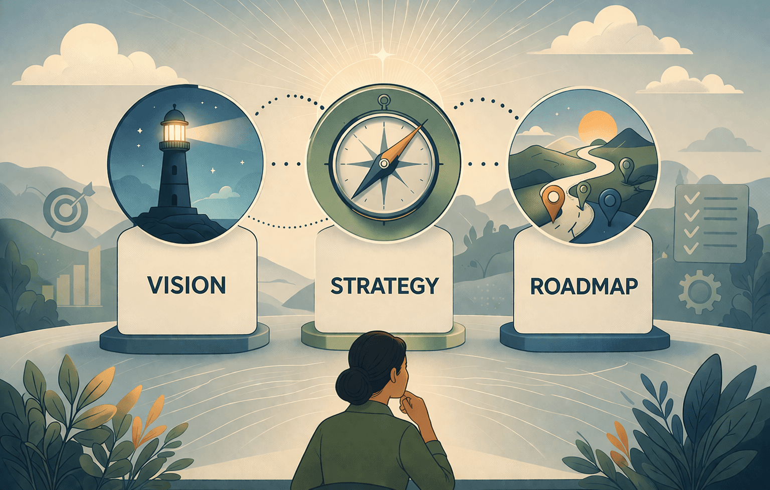 One way to understand the difference is to think in terms of layers. Vision defines where you are going. Strategy defines how you will get there. Roadmap defines what you will do next.